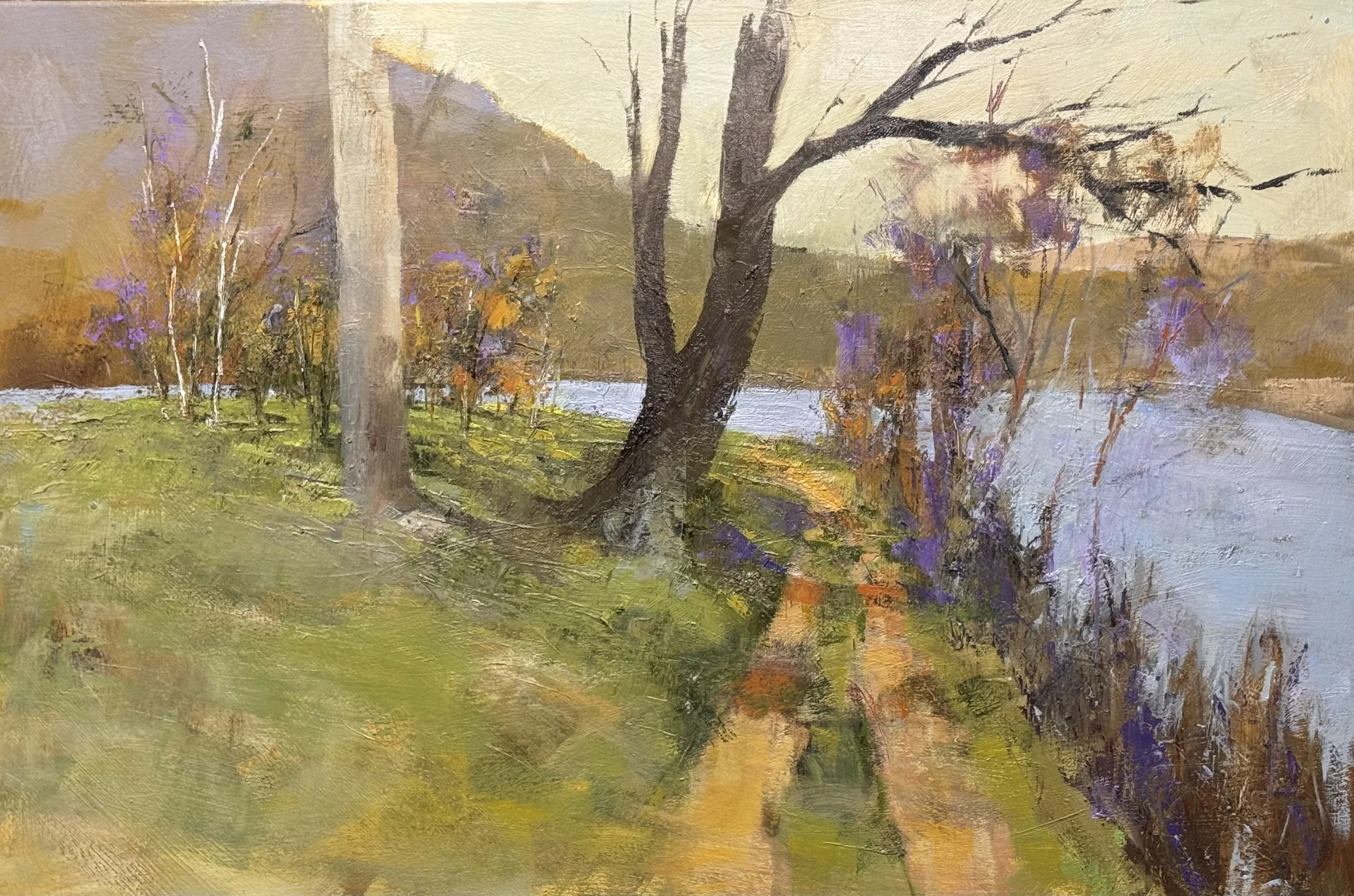 The road's perspective needs to commit. The trunks need to own the ground before they earn their branches. And the willows at the water's edge need to stop decorating and start directing.