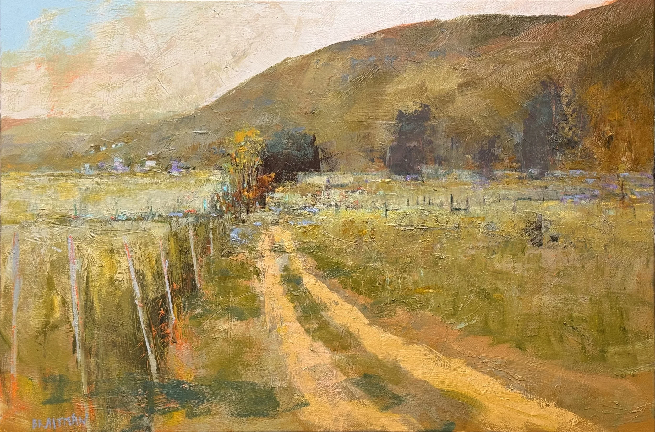 The foreground pulls hard. The mountain holds firm. And between them, the subject — barn, fence line, a ghost of a village in cool lavender — dissolves back into the land it came from.