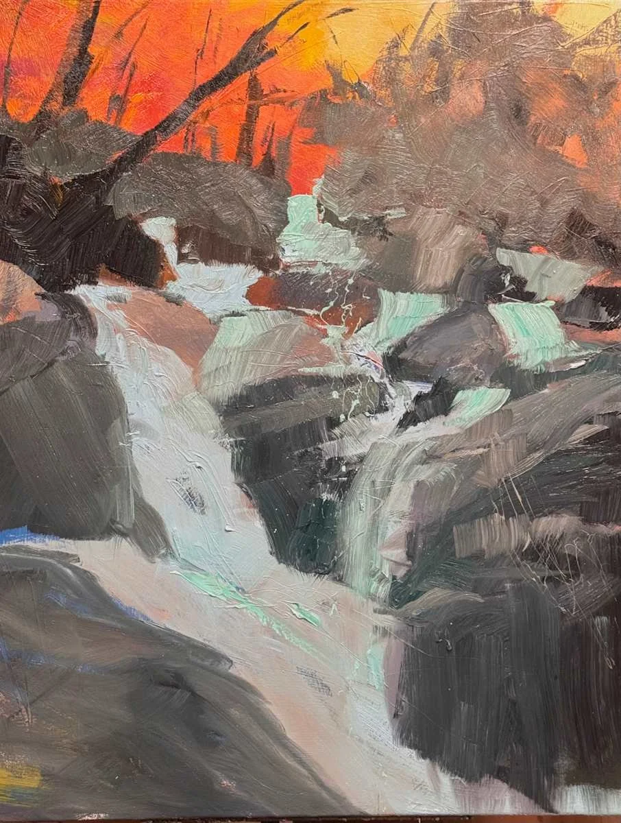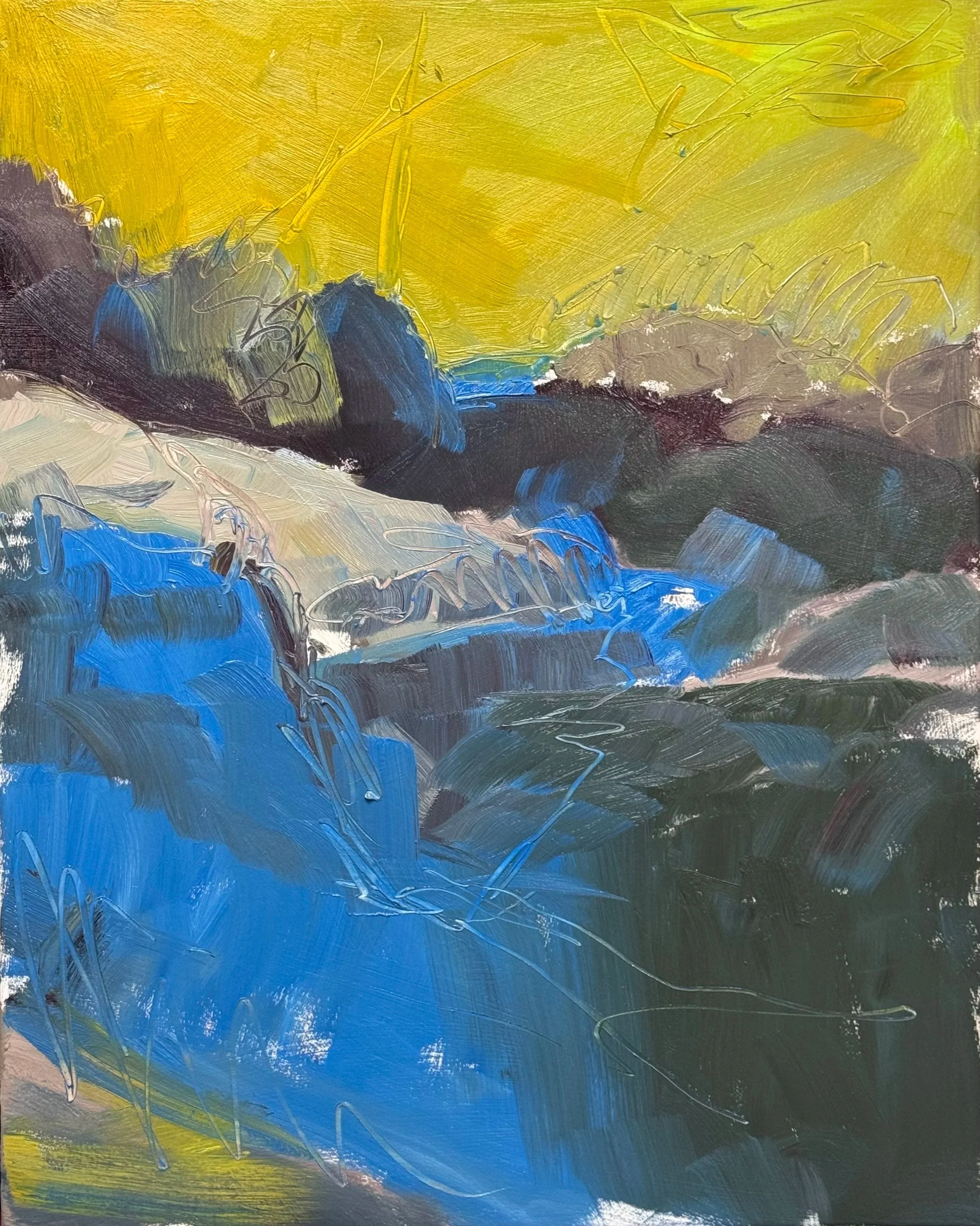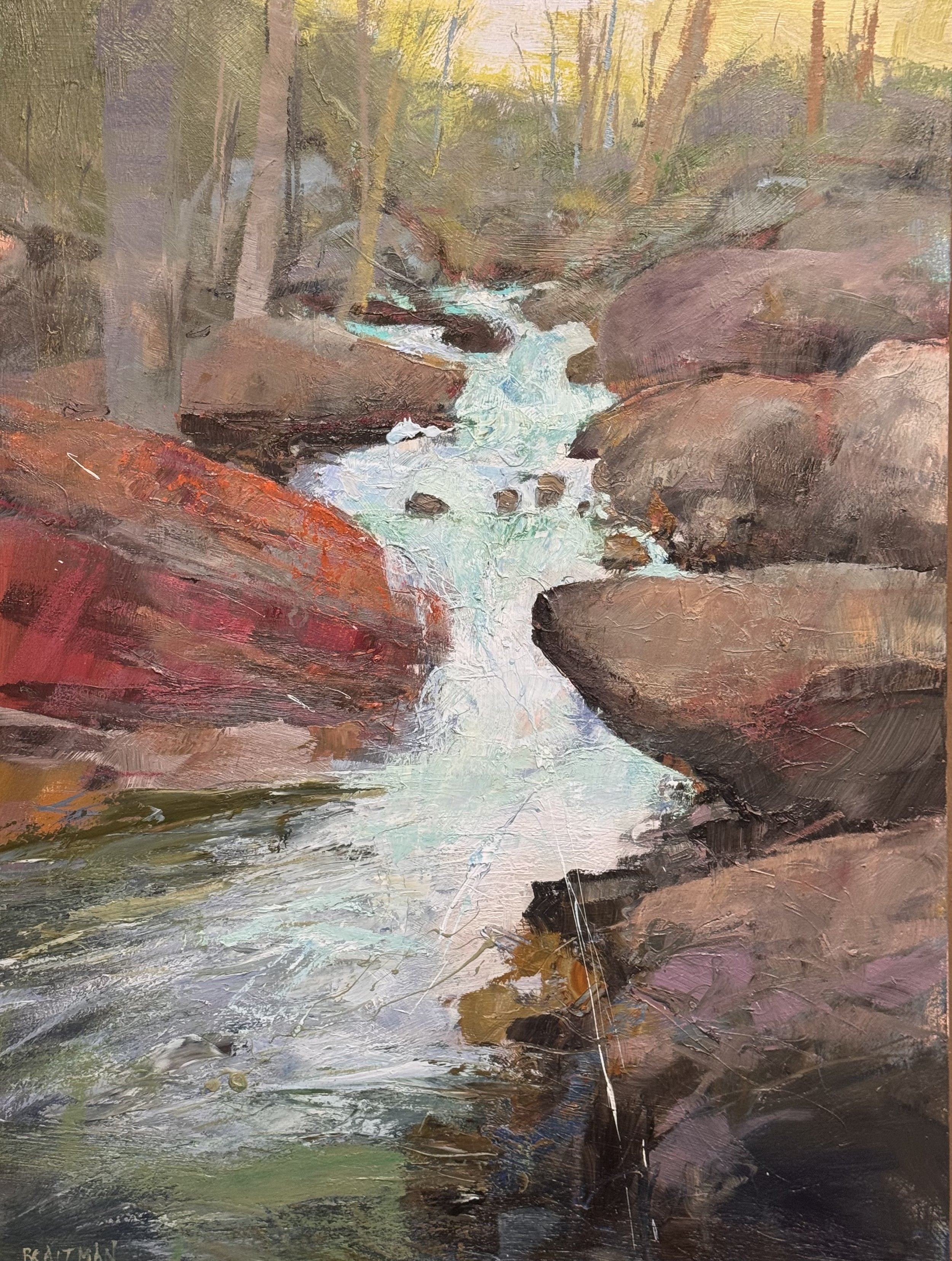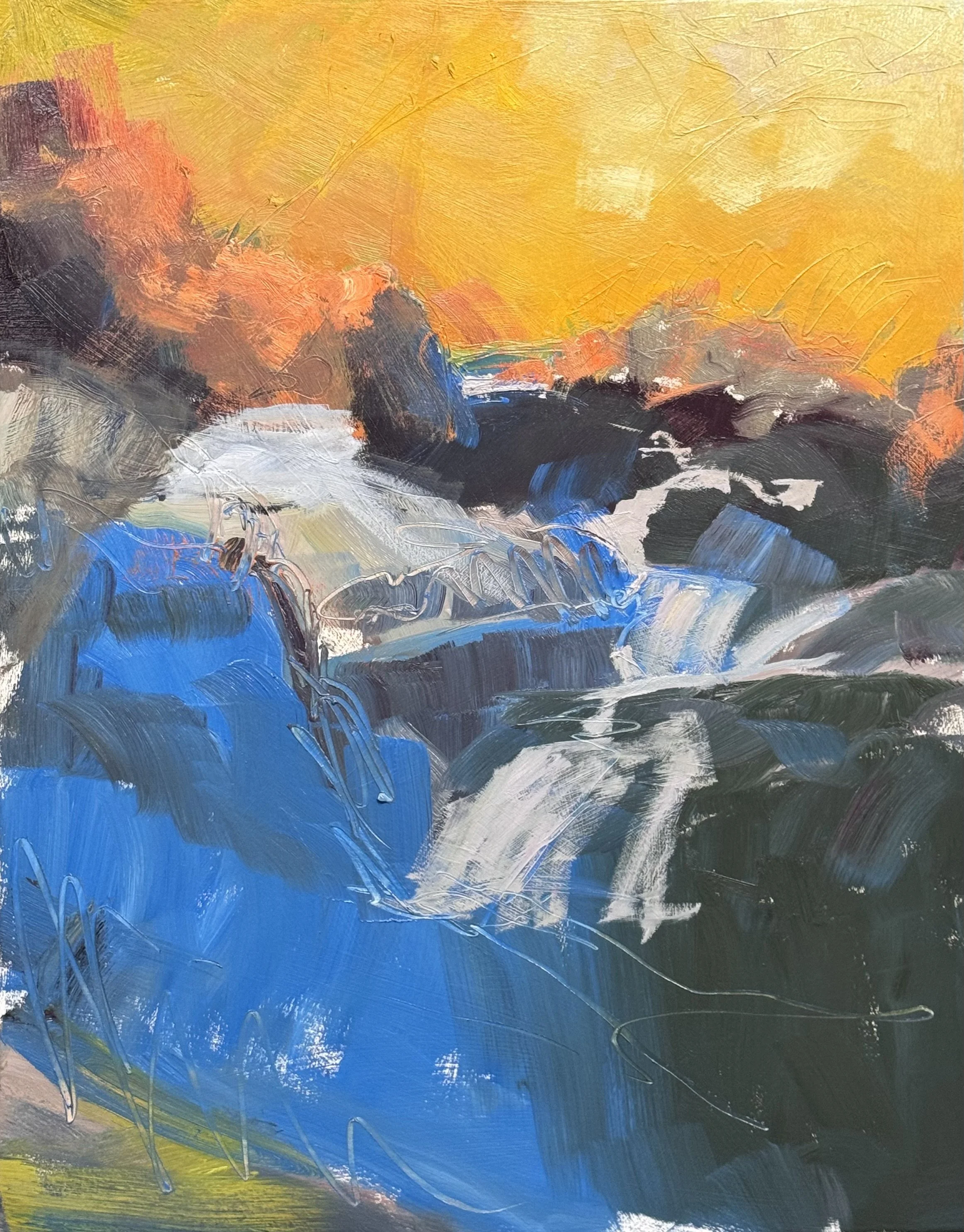 Cascade, 48 × 36 inches, is finished. Enclosed, intimate, the rocks holding the water like a channel carved over centuries. Intimate without being quiet.