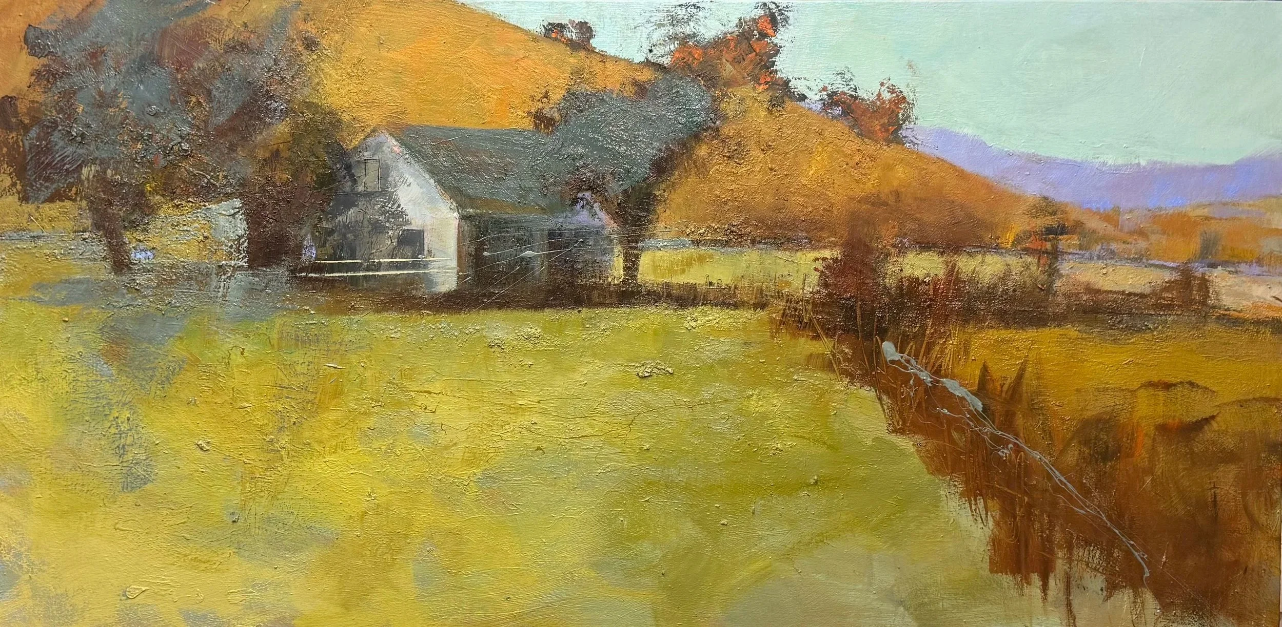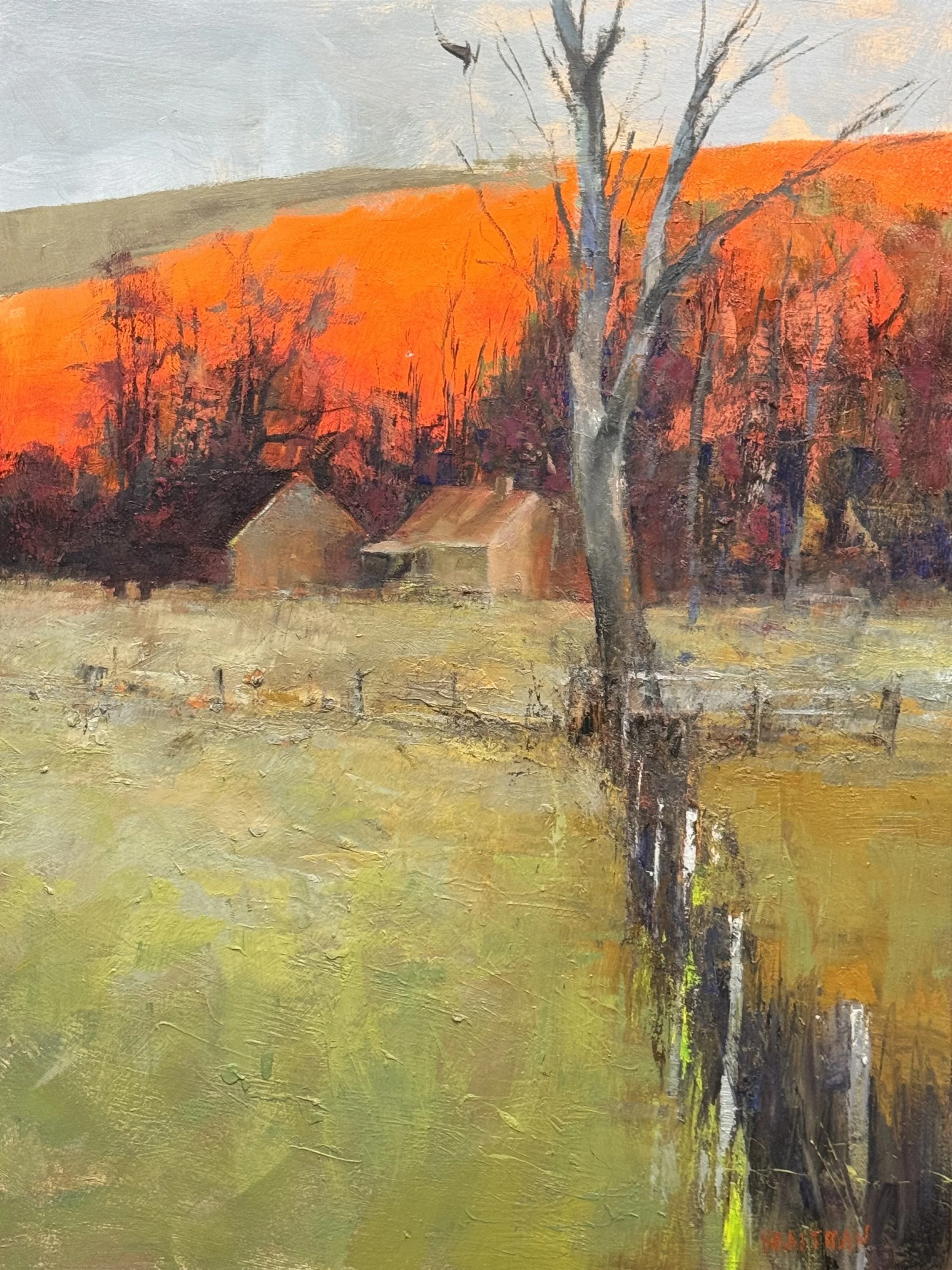 This painting tries to deny it — holding the farmhouse cool and quiet so the eye keeps moving toward that hill. Cadmium Orange Pure, glazed with Alizarin Crimson. It doesn't reflect light. It holds it.