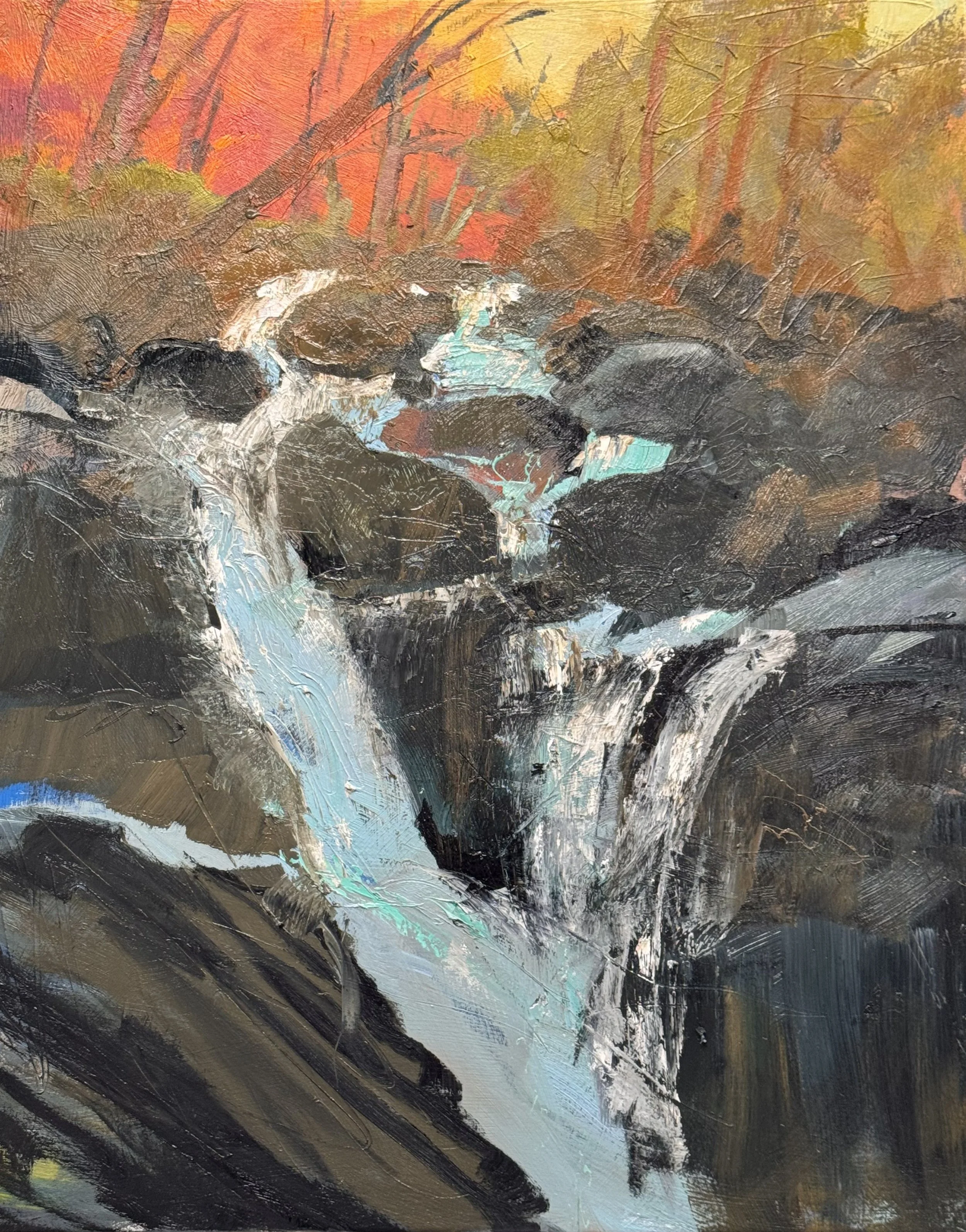 The white water is finding its logic now, cascading in a convincing sequence from upper left down through the rocks. The dark masses are doing their job, giving the falls something to push against. Those flashes of teal tucked between the boulders are quiet but effective — they keep the water feeling transparent and alive rather than just painted white.