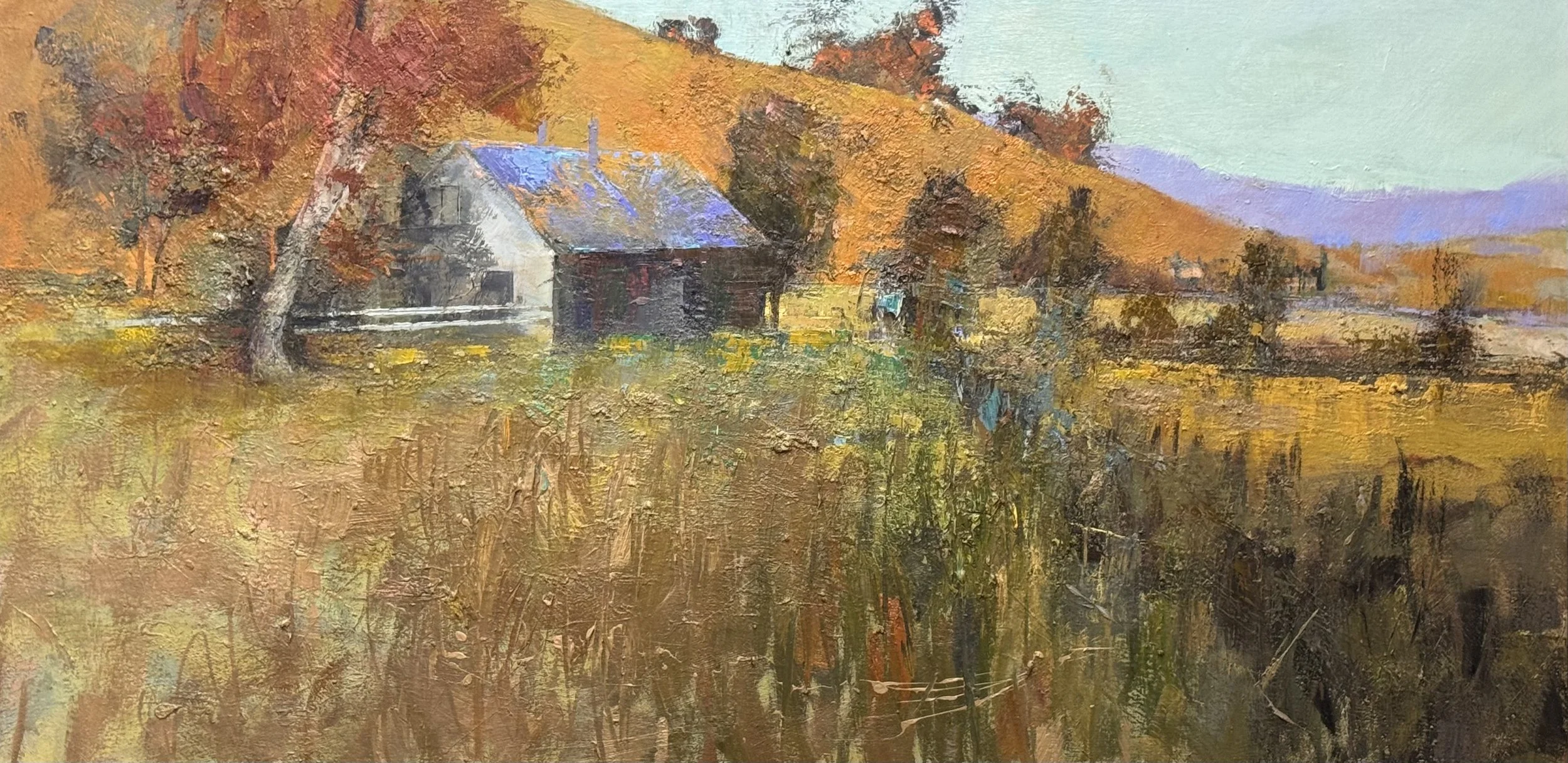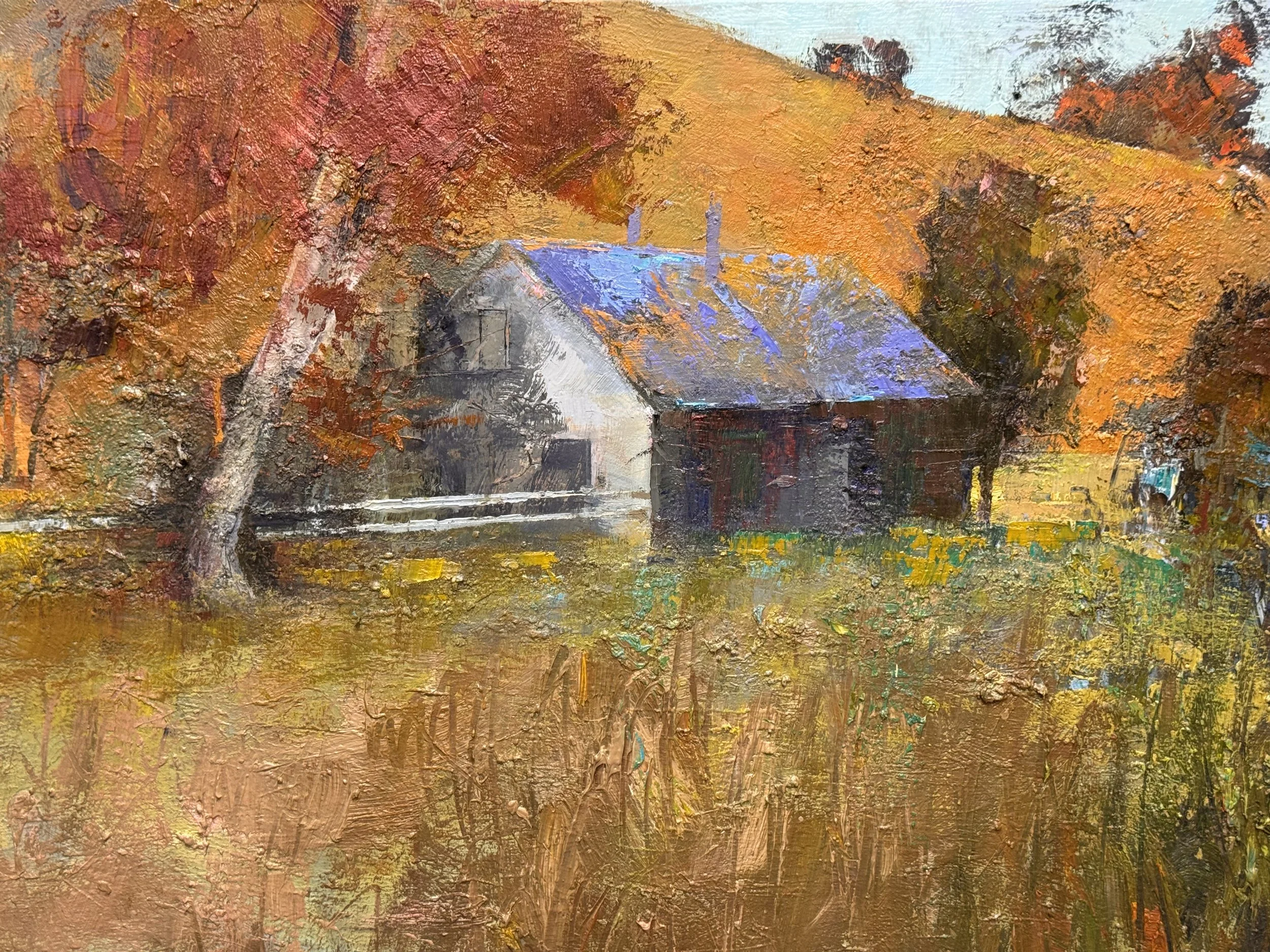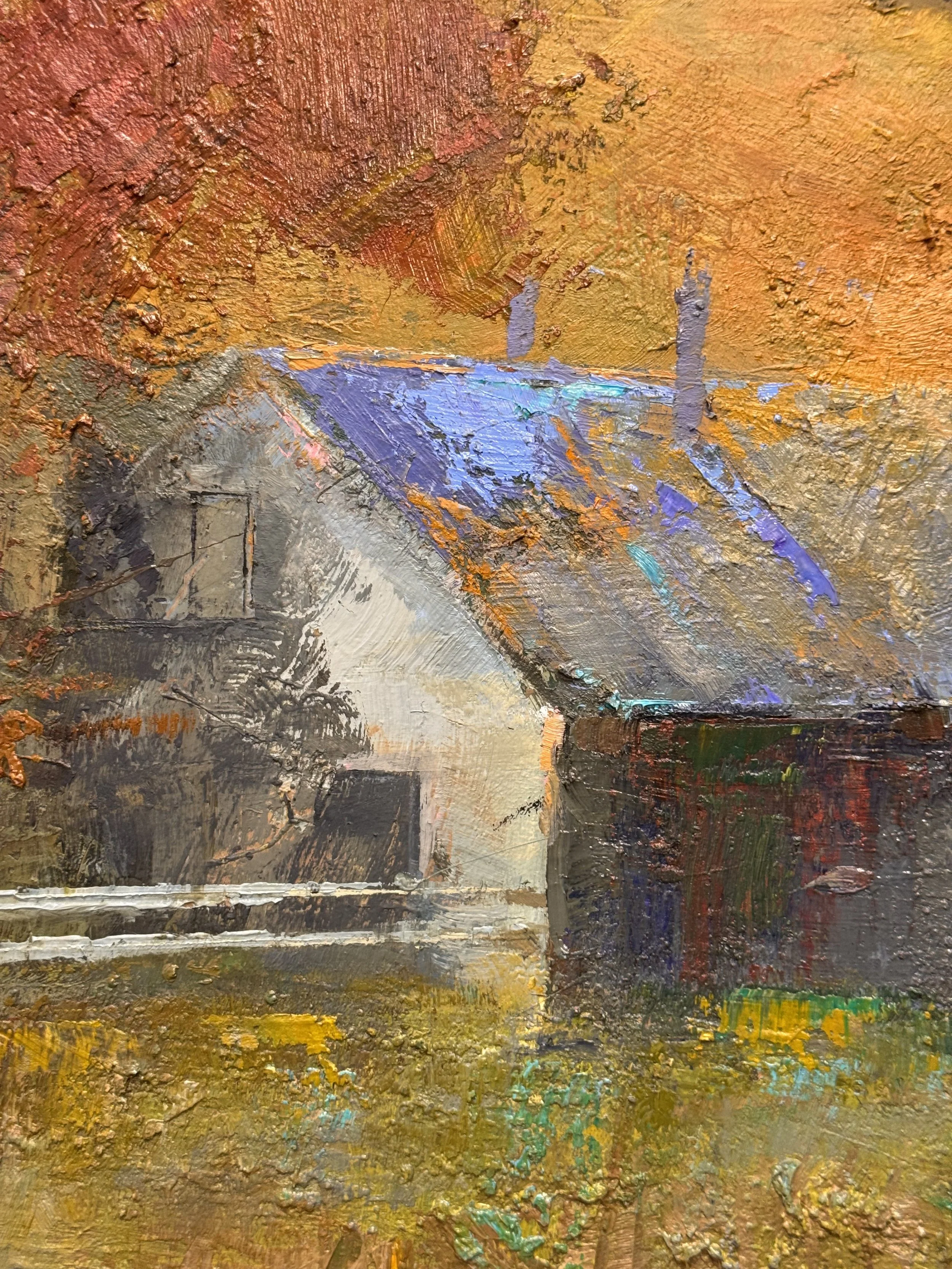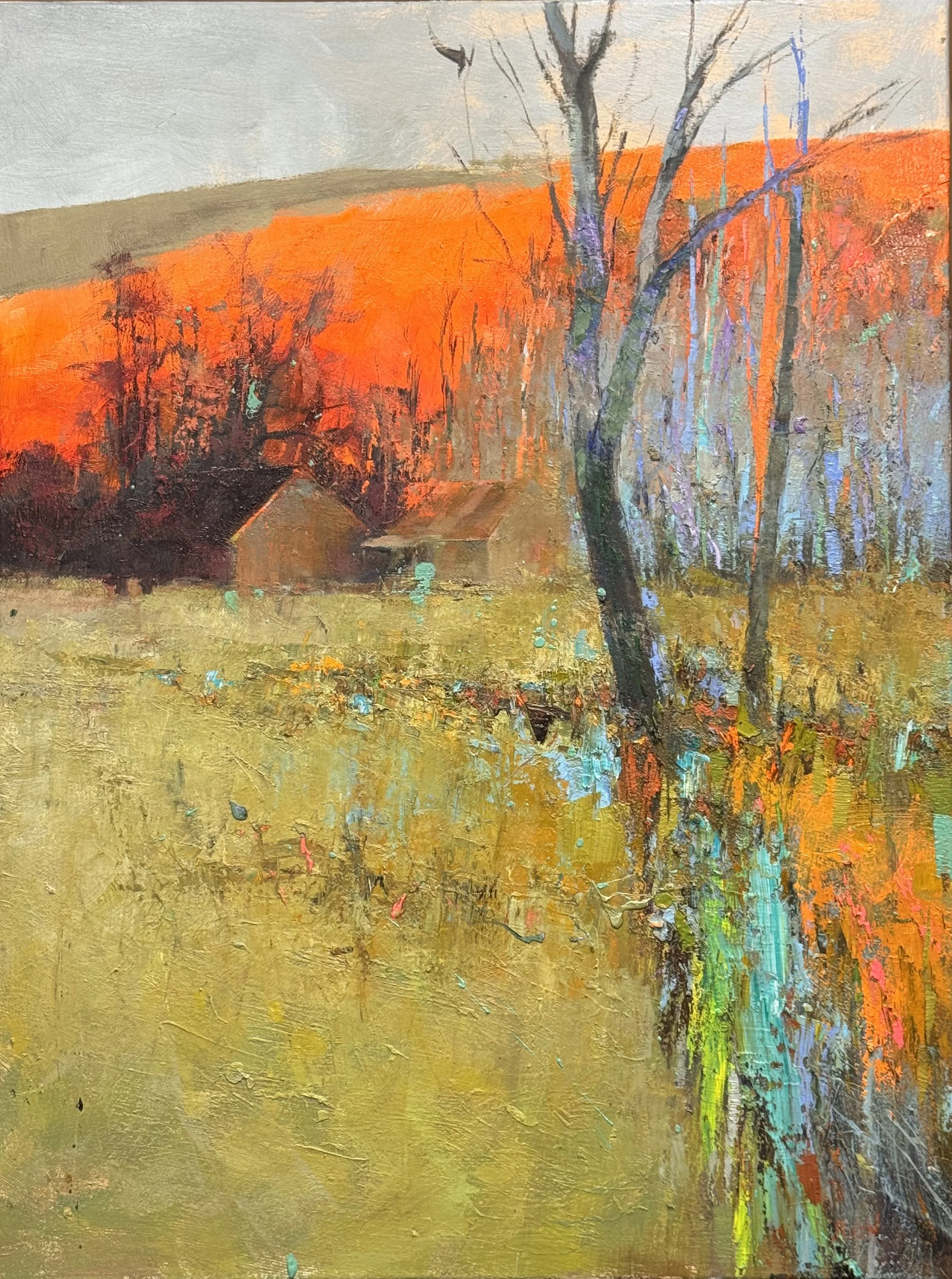 I still have another day of explaining and some added feeling. I think first I must explode onto the bottom 1/3 of the piece to soften the left side and build the right side up with large strokes and richer value. Also, the school bus yellow field on the right and a few other places need the continued suggestion of a horse fience.