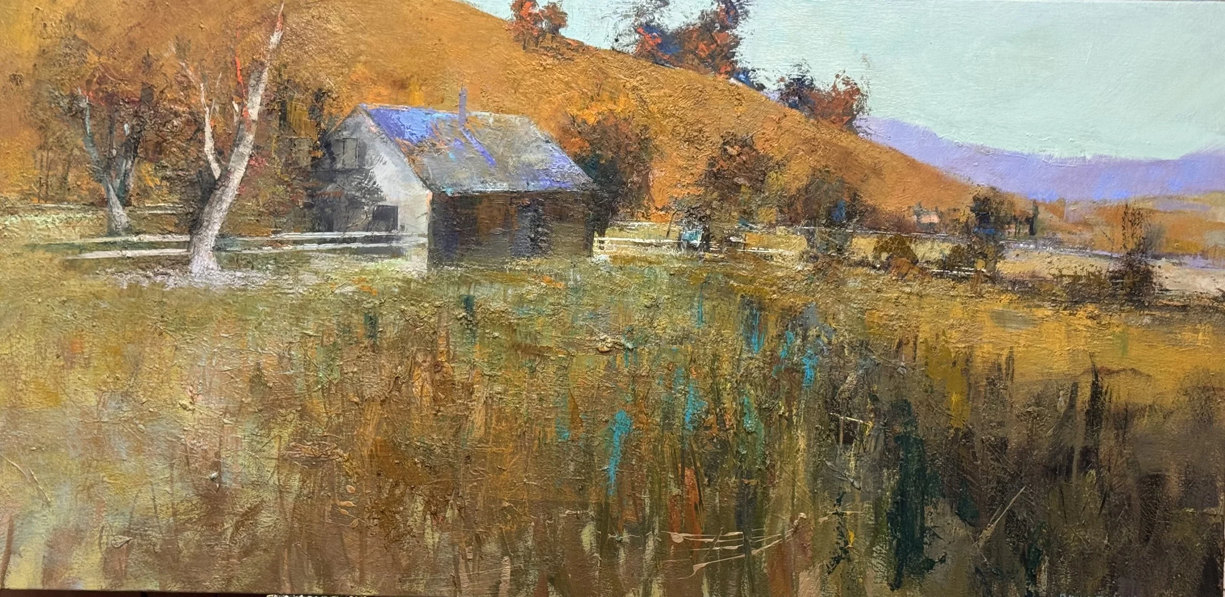 And the whole painting needs to come up in key. The foreground field is absorbing too much light. As the other elements brighten, that should begin to resolve — but some warmer, higher-key strokes through the middle-distance grass will help lift the painting and give the white tree's shadow the contrast it needs to matter. The middle field behind the barn need to brighten as it spills over onto the foreground on the left side
