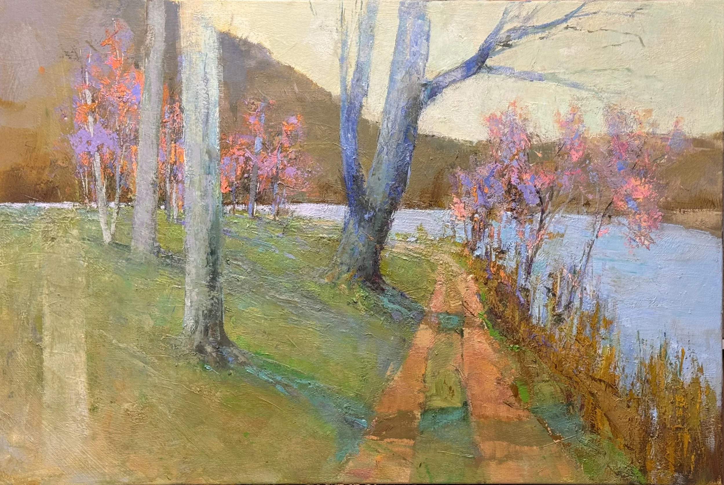 The pair of trees on the left is meant to function as a pivot point — a place where the eye arrives and then has a choice: break left and move deep, or swing right along the shadow toward the barn and beyond. For that to work, the two trees need to read both as individuals and as a group. Right now they're a cluster. The goal is a hinge.